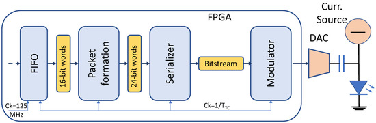 The architecture of the transmitter is sketched in Figure 5. It is composed by several processing blocks connected through an Avalon® streaming bus [26]. Data, moved by the bus, cross all the blocks serially. The data flow is regulated through the backpressure technique implemented in the Avalon® bus: each block, when it is not ready to sink data, rises a ‘busy flag’ that stalls the data flow from the previous block. On the other hand, the processing chain is designed so that each block grants the availability of data as soon as the successive block is ready to accept them. This way, the rate of the data flow along the chain is imposed by the last block, which is the “Modulator”. This architecture grants a constant and uninterrupted data flow at sample rate towards the Digital-to-Analog Converter (DAC) and the LED.