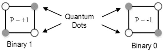 QCA uses quantum dots or metal islands in place of transistors when designing digital circuits. There are four quantum dots in a QCA cell. This is one of the key components of QCA circuits [1,7,8]. Located at the corners of the cell, these quantum dots measure 18 nm by 18 nm. A pair of free electrons reside in the quantum dots diagonal to one another. It is not possible for these electrons to move between the cells, but they can tunnel between the dots. The electrons can be seen as having two polarization states [7]. The values can be either ‘0’ or ‘1’. It is because of the Columbic repulsion between the cells that the cells exhibit these polarization states and information flows between them. Figure 1 shows the basic QCA cell and its polarization states.