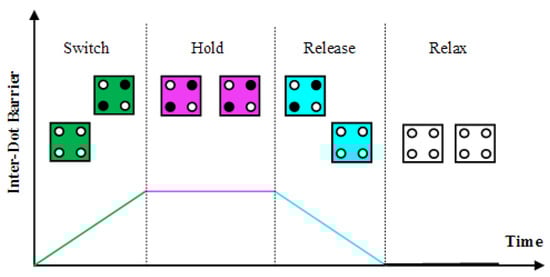 A QCA cell has four clock levels to ensure that the signal power is dissipated in the right direction. These are Switch, Hold, Release, and Relax [7,8]. This QCA clocking is depicted in Figure 2. During the switch phase, the cell switches polarity when the barrier between dots increases, and it maintains its polarity after reaching the barrier during the hold phase. When the cell releases its polarity, it loses its orientation. When the cell reaches the relaxation phase, electrons are free to transfer within [8]. An identical clock signal is sent to the cells within a zone and a sub-array is formed. A maximum of 100 MHz frequency is attainable theoretically in magnetic QCA, up to 1 GHz in semiconductor and 1 THz in molecular QCA [23].