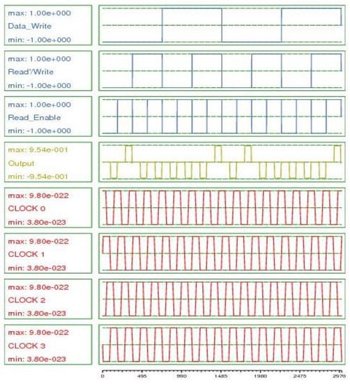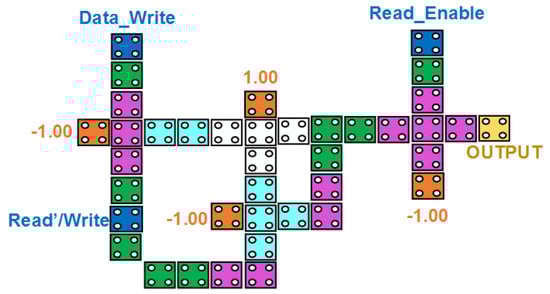 As shown in Figure 5, the output of a memory cell is reached after 1.5 clock cycles in QCA, and it contributes to the latency design. It is validated that when Read’/Write is equal to logic 1, the write state is enabled and the memory loop saves the value of Data_Write. Whenever Read’/Write is equal to logic 0, the read state is enabled and the previously stored bit is given to the output.