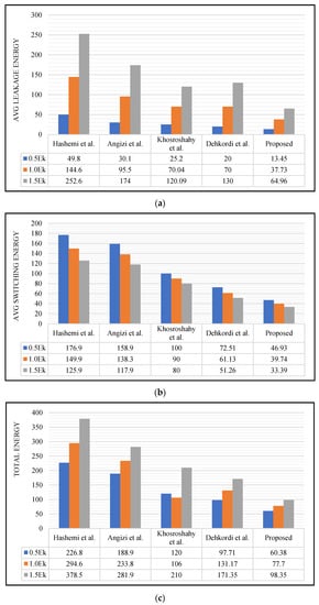Graphical comparison of (a) average leakage, (b) average switching dissipation, and (c) total energy dissipation (meV) of the memory cell at different kink energy levels with designs Hashemi et al. [31], Angizi et al. [30], Khosroshahy et al. [26], Dehkordi et al. [25].