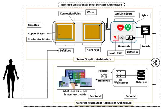 The development of the GMSSB is the symmetrical design between hardware and software. The architecture of SSB hardware consists of copper plates, conductive fiber sheets, four copper plate sheets of the thickness of 1.5 mm with dimensions, and two conductive fabric sheets with an extent of . Two copper plates for the left and two for the right footstep; in between, we arranged the conductive fabrics sheet of 0.2 mm on each side. The Arduino board is attached with small wires and placed on a step box. The Arduino board included the power chip, batteries, Bluetooth module, red and green light, and a switch. The Sensor Step Box was developed using two copper plate sheets and two conductive fiber sheets. The goal of the proposed device is to use gamification principles to encourage people to exercise. The perceived usability of the Gamified Music Sensor Step Box is unaffected by the room’s temperature since it is intended for indoor use. The “Gamified Music Steps” is an interactive software with UNITY 3D [45], built for windows, android, and IOS devices. The participants start by signing up in “Gamified Music Steps”, storing information in the database through the network, and the application starts working. The application includes Korean and English Language, music tracks, workout time records, and leaderboard results. The connectivity between SSB and “Gamified Music Steps” is based on Bluetooth’s preamble bit synchronization signal. Figure 1 shows the architecture of GMSSB. When the participants put their feet.