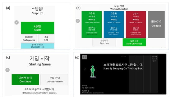 (a)The “Gamified Music Steps” interface shows the application’s opening screen (Bluetooth connectivity test and start exercise), (b) explains the exercise/workout type selection screen, (c) the application screen starts the selected exercise, and, (d) activity start interface.