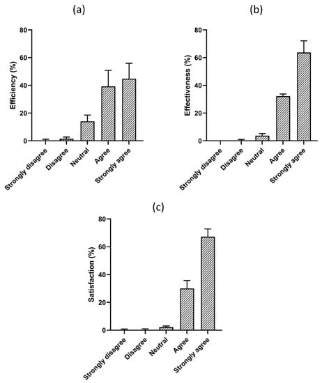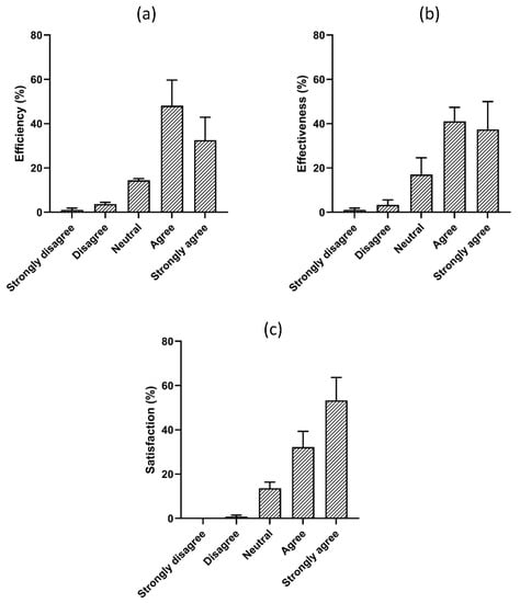 The questionnaires were further categorized into three factors (1) Efficiency, (2) Effectiveness, and (3) Satisfaction, and were evaluated according to these factors in the SSB. The questionnaire efficiency has the highest rate of 44.44%, with an average rate of 32.59, which shows that participants strongly agreed that SSB. is easy to use. For effectiveness, 55.55% of participants support SSB. for positive health. Similarly, 63.33% of participants appreciated the SSB., which improves health with entertainment. Therefore, the satisfaction level has the highest average rate of 53.33%, and effectiveness has scored an average rate of 37.40%. Figure 4a–c represents the perceived usability results for SSB.