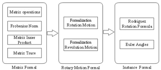 Formal verification relies on mathematical modeling and deductive reasoning, and it is more rigorous and reliable than empirical and heuristic methods [10,11]. Thus, by formally verifying robot rotary kinematics, we hope to ensure the safety of robot controls and their algorithmic designs. In summary, we apply a formal mathematical method of proof to the detection of “correctness’’ in robot rotary kinematics. The formal framework of robot rotary kinematics is illustrated in Figure 1. First, based on Matrix formalization, we formally define the matrix Frobenius norm, matrix trace, and matrix inner product, providing mathematical formal support for the formal verification of robot rotary kinematics. Then, we divide rotary motion into revolution and rotation, defining their formal representations. Based on this, we perform the formal verification of some common rotary problems, including the Euler angles and Rodriguez formula.