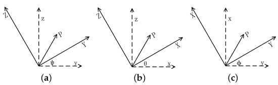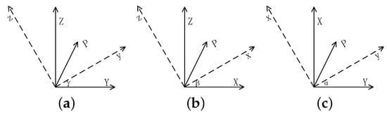 According to the definition of , it can be divided into three cases (see Figure 3). Figure 3a shows the position relation between the two coordinate systems after D (a rigid body) rotates around the X axis of G (global coordinate system), where P is any vector in B. Similarly, Figure 3b,c show the position relationship between the two coordinate systems after D rotates around the Y and Z axes of G.
