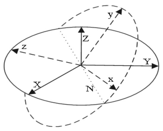 Therefore, the revolution matrix of in the final state is given by Formula (23), where can be obtained from and . Similarly, can be obtained from and .