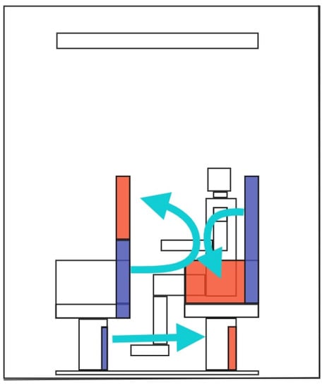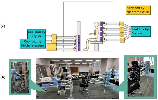 Nichrome wires were used to make heat air for the heating system, while dry ice and Peltier elements were used to make cool air for the cooling system. The temperature to be applied to the feet was assumed to be higher than 25 °C, which was the ambient temperature of the experimental environment. Thus, the temperature was controlled only by the heating system. In other areas, a cooling system created cold air, which was then raised to the appropriate temperature by the heating system containing nichrome wires, and finally, the air was blown out. The created system is shown in Figure 8b. The illustration callouts of Figure 8b are photos seen from the air outlets. Styrofoam boxes with high insulation properties were used for the heating and cooling systems. In addition, the duct was also made of Styrofoam to prevent heat loss. Each box was equipped with a small fan at the discharge point. Only the outlet that directly blows air to the human body was equipped with a 12-centimeter square fan as shown in purple in Figure 8a. To control the setting temperature, a temperature sensor was installed near the outlet as indicated in red in Figure 8a. Using the temperature sensor, the setting temperature was controlled by switching on/off the current flowing to the nichrome wires of each heating system. In the cooling system, dry ice was used for air conditioning to create lower temperatures because the results of the previous study showed that lower temperature settings were required especially for the head part and the upper body [10]. On the other hand, a cooling system with Peltier elements was used for the air conditioning of the thigh parts where the temperature setting was not so low. A Peltier element is called a thermoelectric element that produces a cooling effect when a voltage is applied. The fan at the air outlets that directs airflow to the human body was set at an air velocity of 0.2 m/s. This is because the air conditioning wind speed in the previous study was set at 0.2 m/s [10]. The human body does not feel uncomfortable with this wind speed [40].