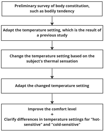 Accordingly, as the first step, a preliminary survey of physical characteristics is conducted. The purpose of this step is to categorize thermal sensitivity of subjects participating in the experiments. The next step is experiment, which is divided into two stages: the first stage is to reproduce the results of the previous study [10], based on practical experiment, instead of simulation. In other words, the first stage experiment can be considered as the baseline. The second stage is to obtain the results of the method which considers subjects’ thermal sensation. Then, the obtained thermal comfort and thermal sensation of the subjects in the first and second stage experiments are used for comparison and analysis. Thus, comfortable setting temperatures and air conditioning controls will be clarified for different thermal sensitivity classes obtained from the first step.