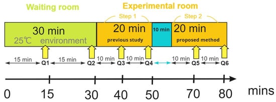 Figure 5 shows the overview of an experimental procedure. The total duration of the experiment was 80 min. Before beginning the experiment, the subjects were asked to sit in a waiting room for 30 min. This is because a resting period of 30 min is necessary to eliminate thermal effects in previous environments [35,36]. In this experiment, the temperature in the waiting room was set at 25 °C because the ambient temperature was set at 25 °C as in [10]. The subjects were asked to stay put in the waiting room for 30 min, where the temperature of the room was 25 °C. Note that the temperature of the waiting room was 25 °C. After spending time in the waiting room, the subject entered the experimental room to start the experiment. The experiment was divided into two stages, as mentioned in the Section 3. The duration of each experiment was set for 20 min because more than 15 min were needed to adapt to the temperature change [37]. The transition duration of step 1 and step 2 was 10 min. During this period, the subject stayed in the waiting room.