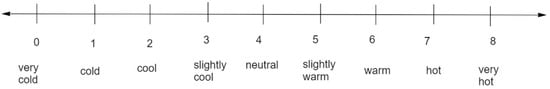 This experiment was evaluated by subjective evaluation. In this study, the thermal sensation and the thermal comfort indexes are based on ASHRAE and ISO, which are widely used in thermal comfort evaluations, were used [34,38,39]. The questionnaires for the subjective evaluation used in this experiment are shown in Figure 6 and Figure 7. The thermal comfort is on a 6-point scale, while the thermal sensation is on a 9-point scale. Although ASHRAE recommends a 6-point scale for thermal sensation, a 9-point scale was used in this experiment to observe the subject’s thermal sensation in more detail.