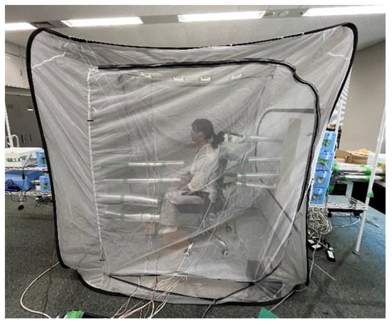 Figure 9 shows a photograph of the actual experimental environment. In order to make the experimental environment close to the model in the simulation, a tent was used to avoid the influence of outside convection. Only one side of the tent was made of a mesh material. Although the simulation model was a completely private room, the mesh material tent was used in this experiment to avoid compromising the comfort of the subject due to carbon dioxide since dry ice was used in this experiment.