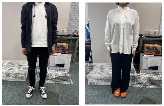 Regarding the clothes thermal insulation of the subjects, according to the reference [41,42], the appropriate clothing insulation at a 25 °C environment is 0.5 clo value. Therefore, the subjects conducted the experiment wearing clothes with the clo value of 0.5. The subjects wore a long-sleeved shirt and pants as in Figure 10 [43].