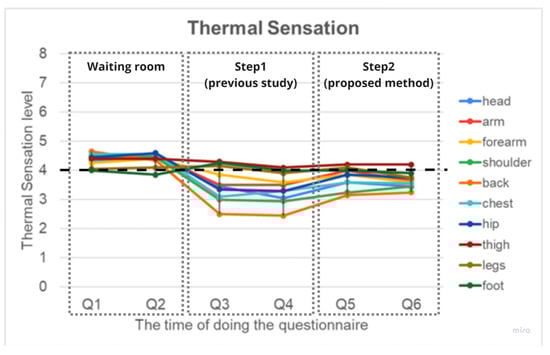 Figure 11 shows the result of the thermal sensation evaluation obtained from 20 subjects. The horizontal axis represents the time at which the questionnaires were conducted, and the vertical axis represents the average value of the thermal sensation index according to Figure 6. Q1 and Q2 are the timings for the questionnaires in the waiting room, and Q3 and Q4 are the timings for the questionnaires when the temperature settings of the previous study were applied [10]. Q5 and Q6 are the timing for the questionnaires after changing the temperature setting. On the thermal sensation scale, closer to 8 means a “hot” sensation, and closer to 0 means a “cold” sensation. The middle 4 is the “neutral” sensation. As indicated in the proposed method, this study assumes that the comfort level improves when the thermal sensation becomes more neutral. Therefore, the expected result is closer to 4 during Q6. Figure 11 indicates that the average thermal sensations in the waiting room (Q1 and Q2) are close to neutral, while the average thermal sensations, when the temperature settings of the previous study were applied [10], were generally cold. However, when the temperature setting was changed, which is suitable for each subject (at Q5 and Q6), the thermal sensation became relatively neutral.
