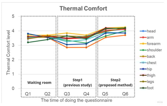 Figure 12 shows the result of the thermal comfort evaluation obtained from 20 subjects. The horizontal axis represents the time at which the questionnaires were conducted, and the vertical axis represents the average value of the thermal comfort index shown in Figure 6. The timing from Q1 to Q2 was the same as the ones in Figure 10. On the scale of the thermal comfort, closer to 5 means “comfortable”, and closer to 0 means “uncomfortable”. A rise in the comfort level is expected during Q5 and Q6 since the proposed method was applied there. From Figure 12, it can be seen that for some body parts, the average value of the thermal comfort level became lower at the temperature settings in the previous study (Q3 and Q4) compared to the timings in the waiting room (Q1 and Q2) [10]. However, it can be observed that the average value of the thermal comfort level increased by changing the temperature setting (Q5 and Q6), relatively achieving neutral level.