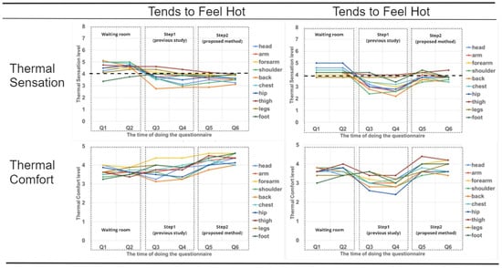 Regarding the thermal sensation, the hot-sensitive group shows little fluctuation overall, while the cold-sensitive group shows a large fluctuation. This is because the temperature setting in the previous study was relatively low, hence, cold-sensitive people felt cold easily [10]. That is why the graph for the cold-sensitive group shows a large fluctuation. However, the results of both the hot-sensitive and cold-sensitive groups show that the last question (Q6) has a near-neutral sensation. Regarding the thermal comfort, the hot-sensitive group shows little fluctuation, while the cold-sensitive group shows a large fluctuation, similar to the thermal sensation. Both groups show that the last question increased the thermal comfort level. Moreover, the comfort level of the hot-sensitive group properly increased in the right direction.