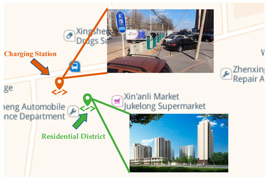 Through the function of inverse geocoding in the Amap open platform [19], the transformed latitude and longitude coordinates of the BEVs at charging time are taken as input, and the corresponding information is returned as shown in Table 4. The Vehicle ID is the BEV number; Name represents the address name of the building closest to the charging location; District represents the area of the building belonging to; Type represents the POI type of the building; Minimum range represents the distance from the nearest building to the charging location (units m). The charging location here refers to the parking position of the electric vehicle in a charging state. Meanwhile, the reason for setting the item ‘Minimum range’ is that, in general, we can directly obtain the POI of the charging position through the address corresponding to the BEV coordinates, which is helpful for us to determine the POI type of charging position (such as residential area). However, some address information does not have a corresponding POI; in order to minimize data loss, we consider using the POI of nearby buildings to supplement based on the premise that the address name is similar. Position represents the longitude and latitude coordinates corresponding to the building. The accuracy of the method is verified by coordinate visualization as shown in the blue flag in Figure 4; the charging position is indeed within the range of the returned address.