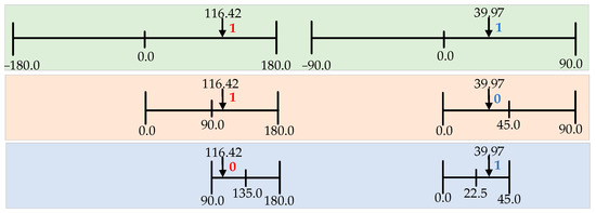 This article uses Python to implement Geohash encoding. The realization process is mainly divided into four steps: (i) The range represented by longitude and latitude is regarded as a two-dimensional plane rectangle; (ii) As shown in the Figure 8, the longitude and latitude coordinates are classified by the similar dichotomy. If the target longitude and latitude are in the division area, the assignment is 1, otherwise the assignment is 0, until the set accuracy requirements are met, and a binary code is obtained; (iii) Figure 9 shows the process of grouping codes based on the coding results. Each binary code is merged by the principle of even-digit longitude and odd-digit latitude; (iv) In order to facilitate the storage and usage, 32 letters in the Table 5 are used for Base32 encoding.
