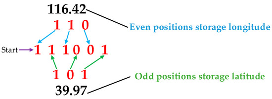 The string length corresponds to the accuracy of the position. The longer the string is, the smaller the divided area is, and the higher accuracy of the position is. Take the coordinates (116.42, 39.97) in Figure 8 as an example. If we require the length of the string to be 4, according to the above process, first, we can obtain the binary codes of longitude and latitude: 1101001011, 1011100011. Then we group the code according to the rules in Figure 9, and the result is 11100 11101 00100 01111. Finally, Base32 coding is performed according to Table 5, and the result is w x4 g.
