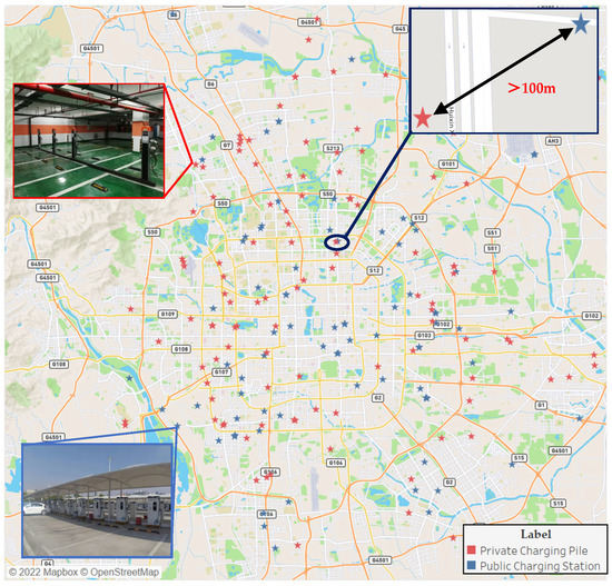 After analysis and filtering, there are 135 users with PCPs, accounting for about 80.4%, and 33 users without PCPs. The classification results of all charging positions are marked on the map, as shown in Figure 10. In addition, for the case where two charging points are close, the distance is also marked in the figure.