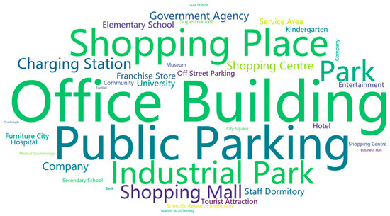 By mining the POI types of users’ common charging points, it can provide assistance in the planning and layout of future charging piles construction [21]. Pagany et al. [22] distinguished categories based on user groups of different POI types, which constitutes the basic method for requirements calculation. Figure 11 and Figure 12 show the POI distribution of charging points of users without PCPs and users with PCPs, respectively. The larger the font is, the larger the proportion of the POI type is. For POI of users without PCPs, a larger proportion is office buildings, industrial parks, public parking, and shopping related places. In general, office buildings or industrial parks can be regarded as the workplace, thus it can be concluded that the users without PCPs often charge in the company; followed by public places (shopping malls, parks, etc.) and public charging stations.