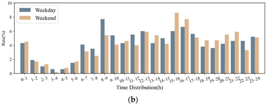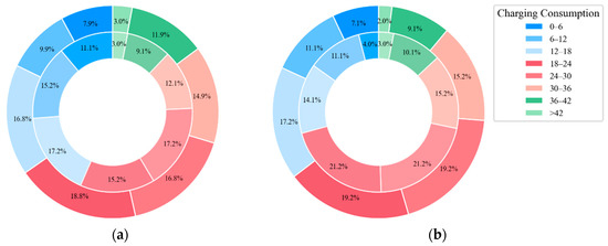 Figure 13a,b shows the charging start time distribution of users with PCPs and users without PCPs. On weekdays, the peak of the charging start time of users with PCPs appears at 18:00–19:00. The possible reason is that people return home from work, then charge in PCPs. However, the peak time of users without PCPs is between 8:00 and 9:00. During this period, consumers may charge in public charging piles near workplaces. Correspondingly, the proportion of users with PCPs choosing to charge in this period is small. The existence of PCPs greatly reduces the users’ dependence on public charging piles.