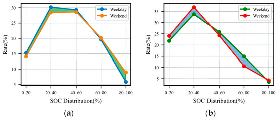 On the weekends, the start charging SOC of users with PCPs has a certain increase in the range of 80–100% SOC, mainly because they consider charging before the weekdays and pay no attention to the current SOC level. Meanwhile, users without PCPs have a certain decrease in the range of 60–80% start charging SOC. They do not choose to charge because of no available charging piles nearby, and the relatively high SOC level that the psychological pressure of users from cruising range anxiety is small.