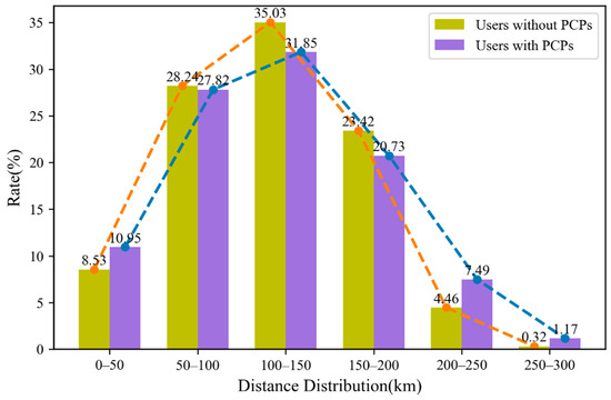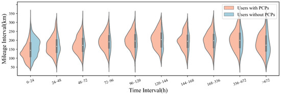 Distance parameters since the last charge can be used to analyze the charging habits of users relative to their driving range. At a relatively small mileage interval (0–50 km), the proportion of users with PCPs (10.95%) is larger than that of users without PCPs (8.53%). Due to the existence of PCPs, consumers have the habit of charging regularly, that is, charging at home after work every time. Therefore, it is possible to predict the charging behavior of users with PCPs [31], so as to provide a reference for optimizing the layout of charging infrastructure, PCP sharing, and realizing the intelligent dispatching of the power grid to some extent.