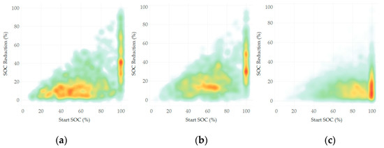 Figure 14 shows the distribution of charging start SOC. Among charging events with 40% or lower start SOC, the proportion of users without PCPs (weekday: 55.9%; weekend: 59.9%) is larger than users with PCPs (weekday: 45.5%; weekend: 42.6%). Unreasonable charging station network layout and weak information interconnection between BEVs and charging piles could cause some problems, such as long charging waiting time and unbalanced utilization of charging stations [25]. Therefore, it can be inferred that the lack of available charging piles nearby is the main reason for the low charging start SOC level. Studies have also shown that the lower the remaining SOC of an BEV, the higher the driver’s mileage anxiety [26,27], so that users without PCPs have higher mileage anxiety. Battery life is shortened in the case of over discharged batteries [28]. For users with PCPs, in order to extend the battery cycle life, it is recommended that people carry out shallow charging and shallow discharging, and to start charging at a relatively high SOC level.