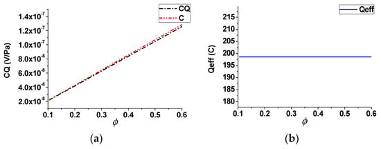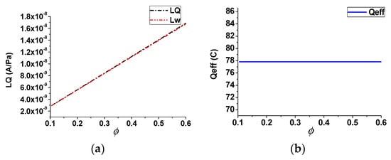 Effect of the porosity (steady case): (a) streaming potential coupling coefficient; (b) effective net residual charge density.