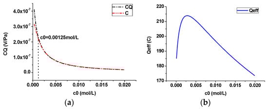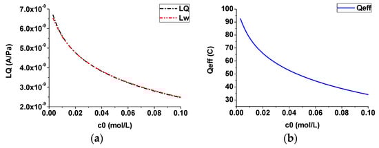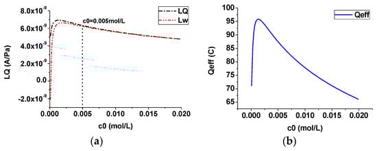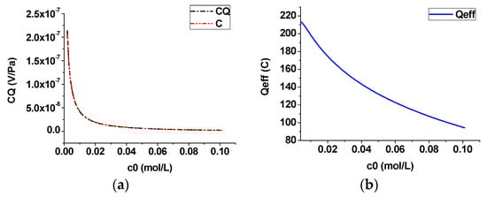 Effect of the salinity (steady case): (a) streaming potential coupling coefficient; (b) effective net residual charge density.