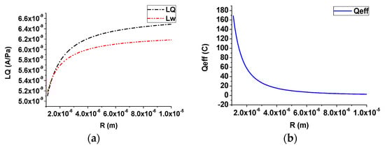 Effect of the pore size (time-harmonic case): (a) streaming current coupling coefficient; (b) effective net residual charge density.