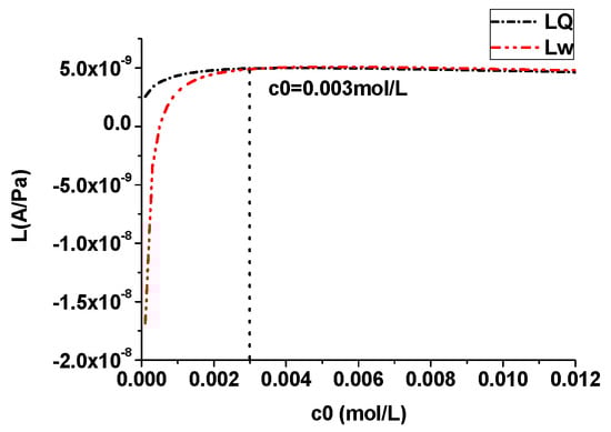 Figure 12 shows the effect of the salinity (including the large-Debye-length case) on the streaming current coupling coefficient calculated using the two methods. The Debye length increased with the decrease in salinity. As shown in Figure 12, with the increase in salinity, the coupling coefficient of the streaming current increased first and then decreased. The effective net residual charge density first increased and then decreased with the increase in salinity, leading to the streaming current coupling coefficient first increasing and then decreasing with the decrease in salinity. When the salinity was large, the Debye length was much smaller than the pore size and the curves of the streaming current coupling coefficient calculated using the two methods overlapped. As the salinity decreased, the Debye length gradually increased; when the salinity was 0.005 mol/L, the Debye length reached the order of m. In this situation, the Debye length was comparable to the pore size ( m), and thus, the results calculated using the Pride theory differed from those found using our method. When the Debye length was greater than the pore radius, the streaming current coupling coefficient calculated using the Pride theory became negative, which is obviously inconsistent with the physical facts and verified that the Pride theory is not suitable when the salinity is too low.