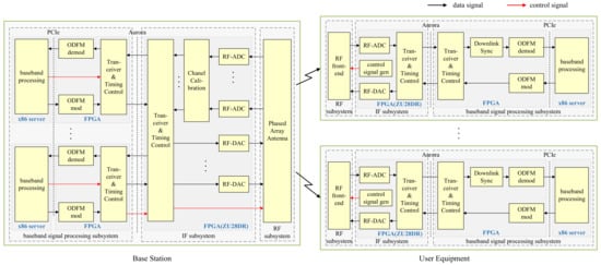 The testbed is divided into BS part and UE part, and both of them consist of three subsystems: radio frequency (RF) subsystem, intermediate frequency (IF) subsystem and baseband signals processing subsystem, as illustrated in Figure 1. For both the BS and the UEs, the RF subsystem is responsible for the conversion between the IF and RF signal and corresponding RF signal processing, the IF subsystem is responsible for the conversion of the analog IF signal and digital baseband signal as well as the data forward, and the baseband signal processing subsystem is responsible for the processing of the baseband signal. Specifically, the x86 servers are responsible for frequency-domain data processing, while alveo u200 and u50 are responsible for the remaining procedures including OFDM modulation/demodulation and downlink synchronization. Differently, control signals for phased array antenna configuration are generated in the x86 server at the BS side, while the control signals for RF front-end configuration are generated in the ZU28DR at the UE side.