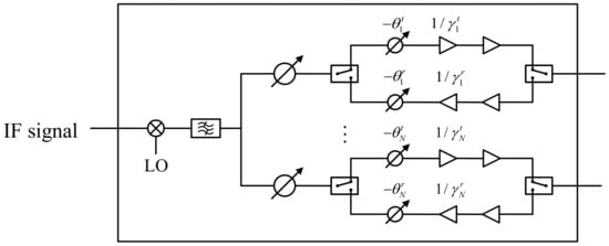 where and are LNA gain and phase shifter value connected to the i-th antenna respectively, is the distance from the horn antenna to the i-th antenna element of phased array antenna, h is the channel gain, and are the amplitude and phase errors caused by the active and passive components connected to the i-th antenna. Taking the first antenna as reference, Equation (1) can be rewritten as