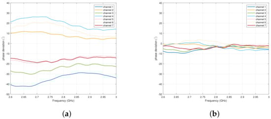 Phase deviations of each channel. The phase differences are reduced from about ∼ to about ∼. (a) Phase deviations before calibration; (b) Phase deviations after calibration.