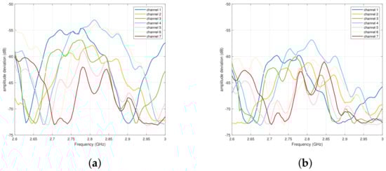 Amplitude deviations of each channel. The maximum amplitude deviations are reduced from about −53 dB to less than −55 dB. (a) Amplitude deviations before calibration; (b) Amplitude deviations after calibration.