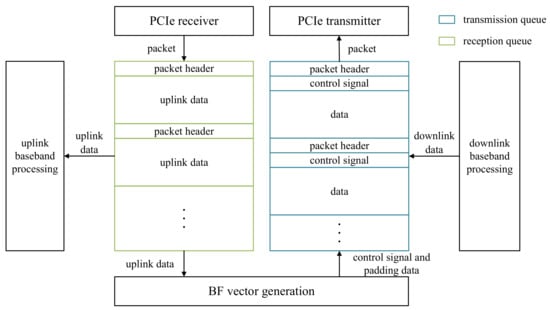 In the downlink slots, six threads are allocated to the downlink baseband processing module to obtain frequency-domain symbols, which are further written to the transmission queue. Meanwhile, the control signals containing beamforming (BF) vectors for reception and PA gain are generated in the BF vector generation module with one thread and written to the transmission queue. After that, the PCIe transmitter allocated with two threads fetches packets from the transmission queue and sends them to the FPGAs.