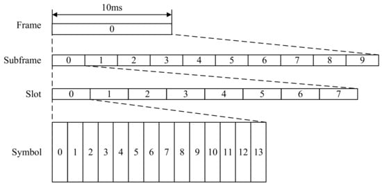 The 5G-like frame structure is adopted in our testbed. Each radio frame has a duration of 10 ms and is divided into ten equal-size subframes of 1 ms duration. Each subframe comprises eight slots for 120 kHz subcarrier spacing. Therefore, each frame consists of 80 slots when subcarrier spacing is 120 kHz. Each slot is further divided into 14 OFDM symbols in our system. The primary synchronization signal (PSS) for downlink synchronization is placed in the first OFDM symbol of each frame according to 5G NR standards. The frame structure designed for our testbed is shown in Figure 8.