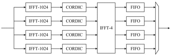 The architecture of the corresponding parallel IFFT module is presented in Figure 9. Complex multiplication and 1024-point IFFT are implemented using the CORDIC IP core and FFT IP core, respectively. The 4-point IFFT is implemented simply by adding/subtracting and exchanging real and imaginary parts of data. The results are finally output serially via FIFO.