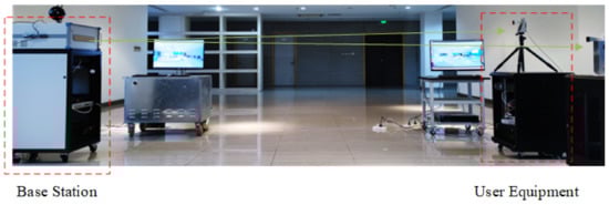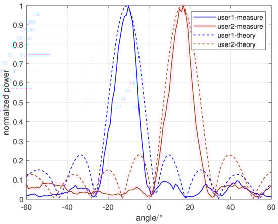 To verify the performance of our testbed in a multi-beam scenario, two UEs and one BS are used for measurement. They are placed in the indoor near-field scenario, as shown in Figure 10. The first user is placed at an angle of 16, while the other user is at an angle of −11, where the positive angle means clockwise to the normal of the BS.