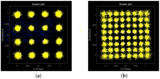 Received constellations under different modulation schemes. (a) Received constellation under 16-QAM modulation; (b) Received constellation under 64-QAM modulation.