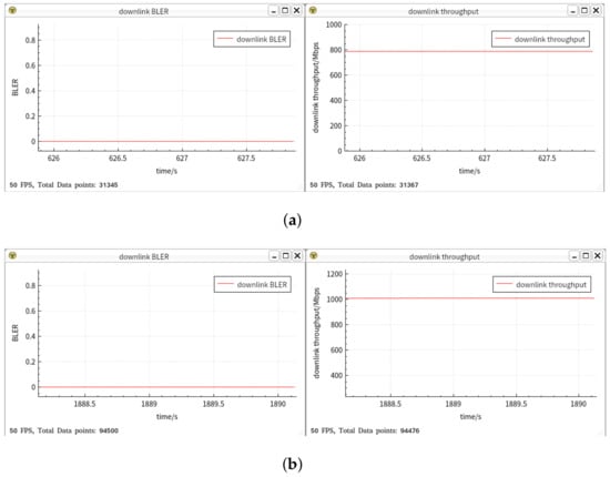 The block error rate (BLER) and throughput results of our example testbed are presented in Figure 13. Under the −7.5 dBm received power, the BLER of the two modulation schemes is low (less than during the experiment under both modulation schemes), which means that both modulation schemes can be applied in practical scenarios. In addition, the receiving throughput under 16-QAM modulation and 64-QAM can reach about 787.3 Mbps and 1009.3 Mbps, respectively, indicating that the system can achieve a throughput of more than 1 Gbps of each beam in the near-field scenario.