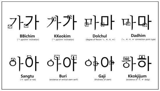 In a previous study [,,], we defined the design elements of Hangul and automatically detected them using a deep learning model. The criteria for determining the similarity between the types of Hangul are derived based on research conducted by the Korean Intellectual Property Office []. In this study, the morphological characteristics of Hangul and the classification system of Hangul type were summarized, and fonts with similar visual characteristics were classified for typography design experts. As a result, the criteria for determining the similarity of the Korean type were proposed. The criteria for determining the similarity based on the Korean font correspond to elements that can be characteristically found in consonants and vowels, and examples are shown in Table 1.