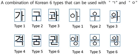On the other hand, there are six forms of letters that can be combined in Korean, including Chosung (initial consonant), Jungsung (middle vowel), and Jongsung (final consonant) letters. Figure 4 is a combination of six forms of letter combinations that can be combined into ‘ㄱ’ and ‘ㅇ’.