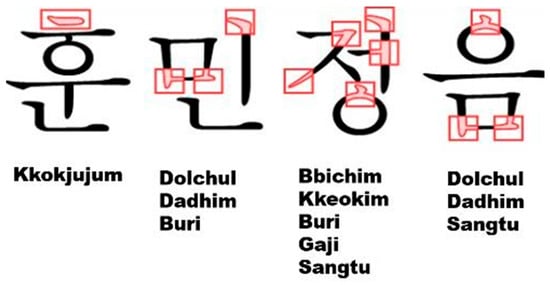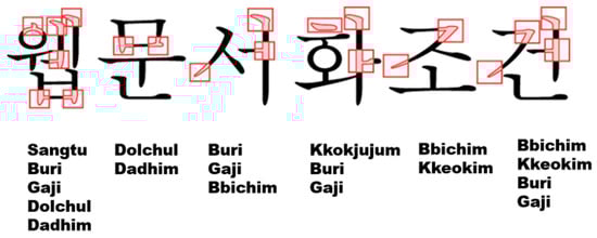 - Jeon, J.Y.; Park, D.Y.; Lim, S.Y.; Ji, Y.S.; Lim, S.B. Automatic Extraction of Hangul Stroke Element Using Faster R-CNN for Font Similarity. J. Korea Multimed. Soc. 2020, 23, 953–964. [Google Scholar]