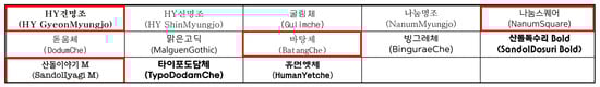 The four-font selections to verify similarity through the survey showed remarkable font characteristics in terms of the font’s structure, such as stroke elements, skeleton, and thickness, and primarily selected fonts that can represent several Korean fonts. To this end, the standard for the Korean font shape classification system (TTAK.KO10.0906-Part2) [] was referenced, and four fonts were finally selected: ‘HY견명조’, ‘나눔스퀘어’, ‘바탕체’, and ‘산돌이야기M’. The above four fonts are used as reference fonts for the user font similarity ranking survey, and examples of the four fonts are fonts marked with red borders in Figure 7. The remaining comparative fonts can be checked together.