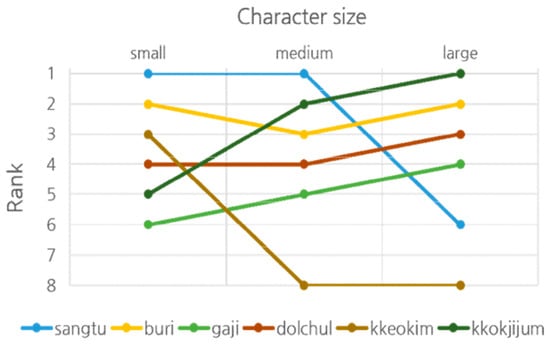 The most influential stroke elements in small and medium letter sizes were “sangtu” and “kkokjijum” in large letter sizes. On the other hand, the least influential elements were “dadhim” in small letter size and “kkeokim” in medium letter size and large letter size. The change in the influence ranking of the stroke element according to size is shown in Figure 8.