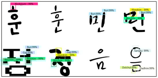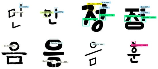 Overall, except for ‘Kkeokim’, the performance seems to have been lowered due to the failure of the detection. This shows a lower detection accuracy than previous studies, but it is due to the expansion of representative letters from simple letters to six form combinations. Considering this, the shape of consonants and vowels in Hangul changes slightly depending on the combined form, it is not judged to be a significant performance degradation. When the mAP indicators for each stroke element of Group B were checked, ‘Gaji’ (100%), ‘Buri’ (87.5%), ‘Kkokjijum’ (87.5%), ‘Bbichim’ (82.81%), and ‘Kkeokim’ (75%) showed relatively high mAP values, and on the contrary, ‘Dolchul’ (28.12%), ‘Dadhim’ (19.20%), and ‘Sangtu’ (18.75%) showed low mAP values. In addition, in the case of Group B, the ‘Bbichim’ was about 83%, and there were many cases of incorrect detection (FP) by confusing the vowel conclusion and pouting. An example image of the detection result of Group B is shown in Figure 9 below.