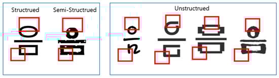 The first limitation is that all existing studies [,] have been studied only on formal fonts corresponding to printed materials. Formal fonts refer to structured fonts used in printed materials, and in this paper, they are called structured fonts. However, there are countless irregular fonts such as handwriting and graphic typefaces, and the font recommendation system should be able to recommend such irregular fonts. In this study, to make it possible to recommend the fonts with irregular shapes in the font recommendation system, we classified Korean fonts into three groups based on the form of the font: structured font (A), semi-structured font (B), and unstructured font (C). The classified Korean fonts are applied to a model that automatically extracts stroke elements of fonts for each group, and the stroke elements are automatically extracted. Finally, the accuracy of extraction of stroke elements for each group is compared with each other to determine whether it is possible to add to the font recommendation system.